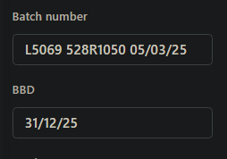 - Batch number field: Add Lot number, Product number, and production time/date. If it is the production date instead of time, please use the same format for date as for BBD below (DD/MM/YY)